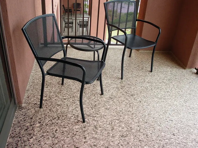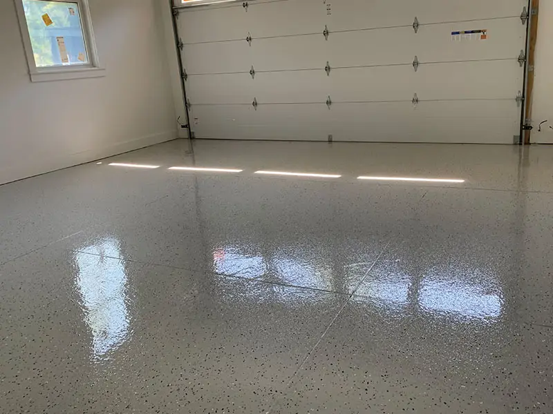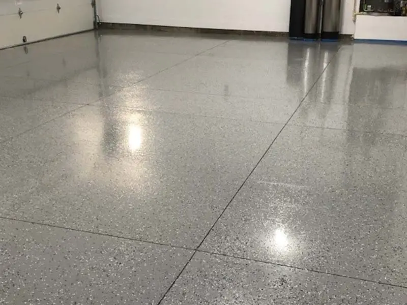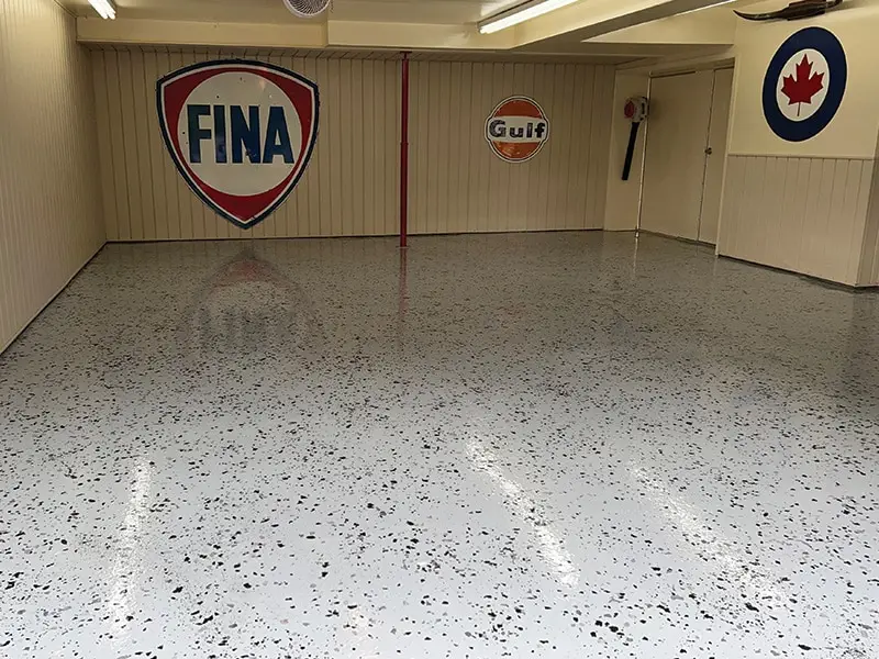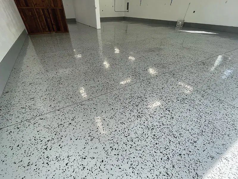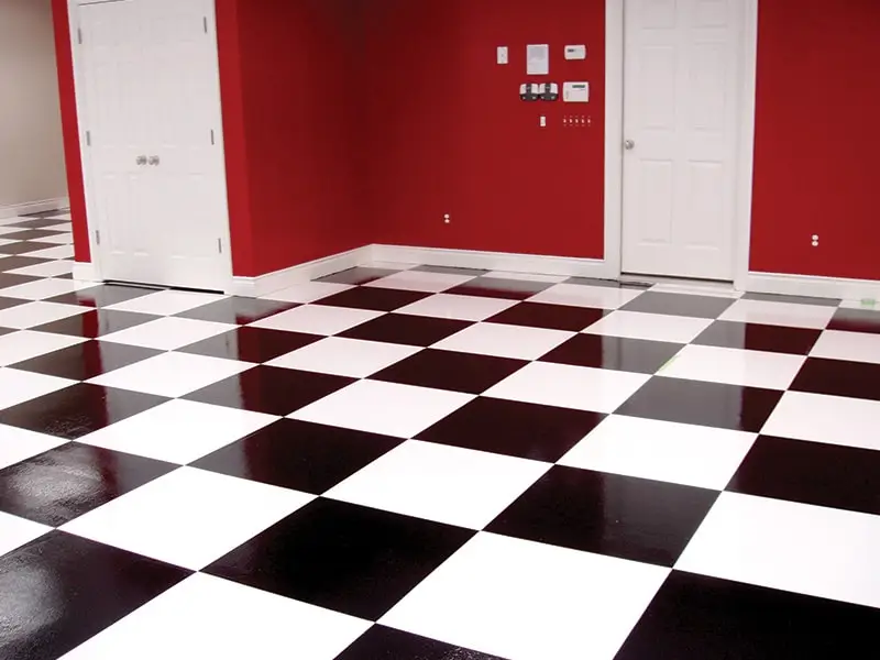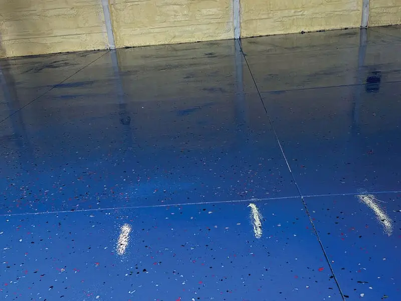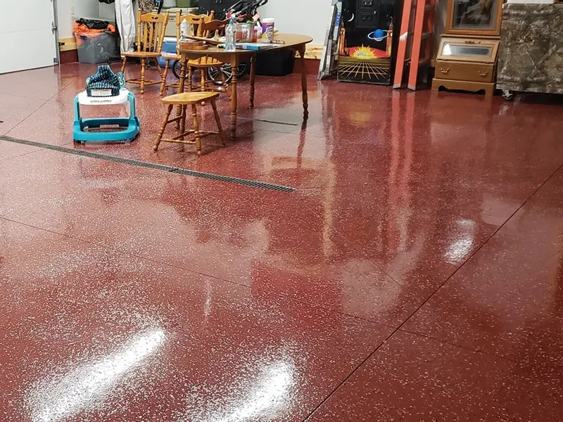 Primer: UCoat Tile Red water based epoxy – Base: UCoat Tile Red water based with UFlek Colonial Flakes- Top Coat: UGloss