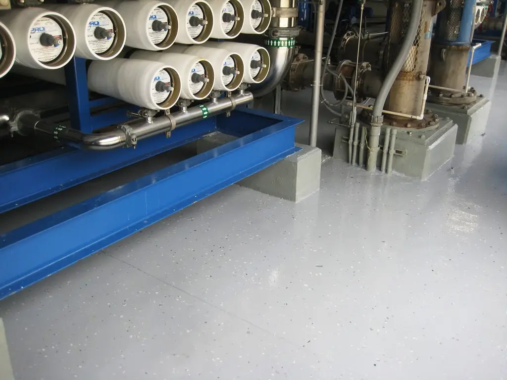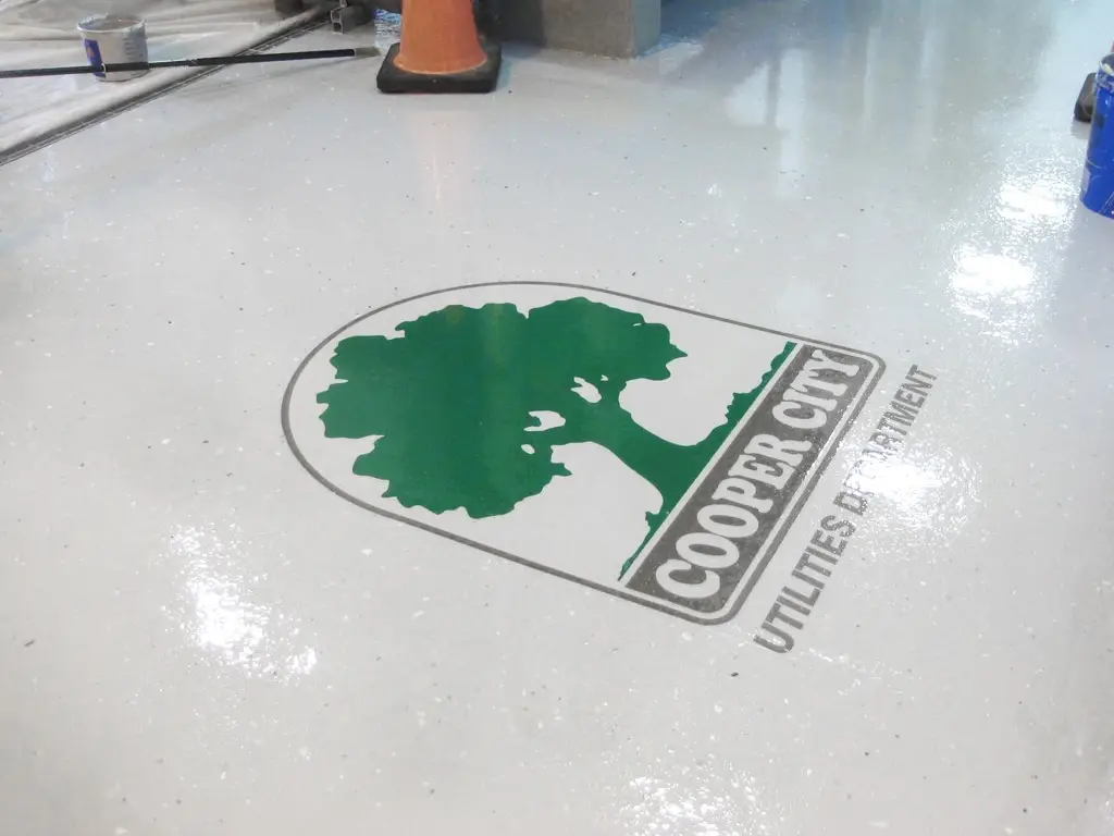 The concrete floors throughout the facility, including storage rooms, water treatment and traffic areas were finished in UCoat Medium Gray with a UFlek-AF Dove top coat. All cracks, chips, and spalled areas were filled using various prep materials in order to create a smooth surface, on which the systems could be applied. The Cooper City Utilities logo was painted directly onto the floor using a two-part urethane paint and then top coated with UGloss-AF clear.