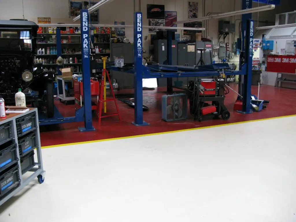 The garage is divided into two areas, the perimeter and the general working area which had been painted in red while the main traffic-ways were a lighter color. Jay wanted to keep the same layout, so the areas were stripped of the existing coating and recoated with UCoat It. The finished floors had a two-tone color scheme: UCoat Tile Red with UGloss-AF topcoat was used for the general working areas, while the interior traffic areas are finished with a custom mix of UCoat Beige and Antique White. These areas were then trimmed with a UGloss-AF Safety Yellow stripe and the entire area top coated with UGloss-AF clear for uniformity.