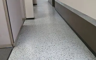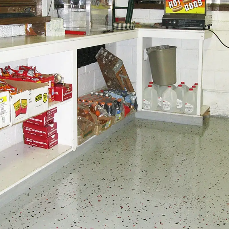The UCoat with UFlek system is a three coat system containing our UCoat water based epoxy, UGloss water based aliphatic high performance urethane and decorative UFlek flakes. This system is ideal for areas like offices, locker rooms and basements as it is odor free, non-flammable and dries quickly to reduce downtime. The UCoat with UFlek system provides a semi-gloss to high gloss finish and with the UFlek flakes creates a terrazzo like finish camouflaging most imperfections in the substrate.